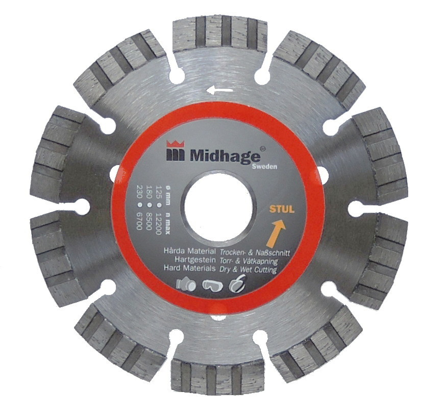 Lasersvetsad segmentklinga med spår för kylning och dammtransport, extra robust. Mycket god skärförmåga i hårda material. Grovt snitt. Lång livslängd. Avsedd för extremt hård natursten, flinta, vit granit, röd granit, Tranås-