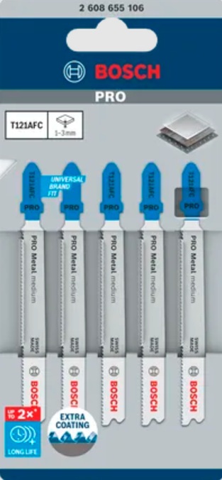T 118 AFC Flexible for Metal sticksågblad är obrytbart vid sågning av raka snitt i metall. Dess valsade vågtandning är utformad för sågning i plåt. Bladets fullt härdade tandrad av HSS (snabbstål) är hopfogad med dess kropp av högelastiskt HCS (stål med hög kolhalt) till en bimetall, vilket minskar brottrisken samt ger både tillräcklig hårdhet och den flexibilitet som krävs för att såga perforerad stålplåt av standardhållfasthet. Det har progressiv, mycket fin tandutformning (1,1–1,5 mm) för sågning i olika typer av tunn plåt med tjockleken 1–3 mm. För användning med sticksågar med T-skaftsystem för fasthållning.