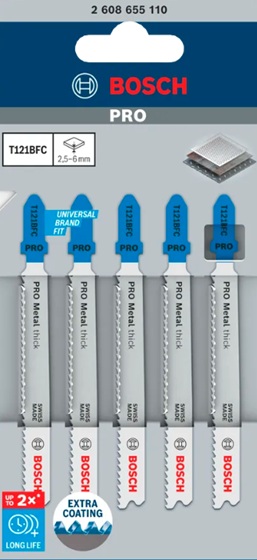 Sticksågblad Bosch PRO T121BFC 92mm 5-Pack. För medelgrov plåt ca 2,5 - 6mm.