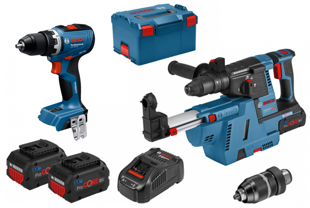 Elverktygssats Batteriborrhammare Bosch GBH 18V-26F + 1st Dammadapter GDE 18V-16 + 2st Batterier Bosch ProCore 18V 5,5Ah Li-Ion, 1st Snabbladdare Bosch GAL1880CV, 1st Snabbchuck 13mm, 1st Snabbchuck SDS-plus, 1st L-Boxx 238 + 1st Batteriskruvdragare Bosch GSR 18V-65 Solo
