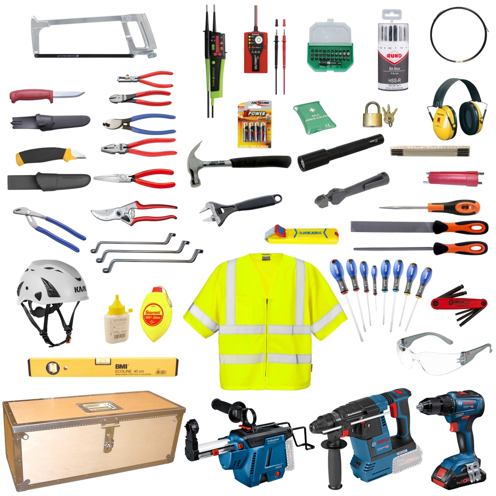 Verktygssats innehållande grundläggande utrustning för elektriker.